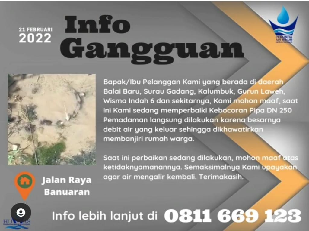 today 21 Feb 2022 , 18:42:42 | oleh : Humas PERUMDAM Kota PadangAssalamualaikum ww Selamat Sore Bapak/Ibu pelanggan yth, Saat ini Kami sedang melakukan pekerjaan Perbaikan Kebocoran Pipa DN 250 PVC di Lolo Kasiak, Gunung Sarik. Kepada pelanggan Kami yang berada di . . .